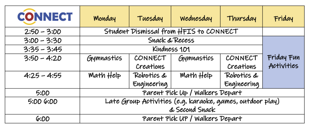 A day at CONNECT offers snack, two classes, and recess. Friday’s we always have fun activities including visits from our West Point Friend and Field Trips to nearby sites. If you would like to know more about CONNECT we encourage you to visit our website at www.hffmconnect.org