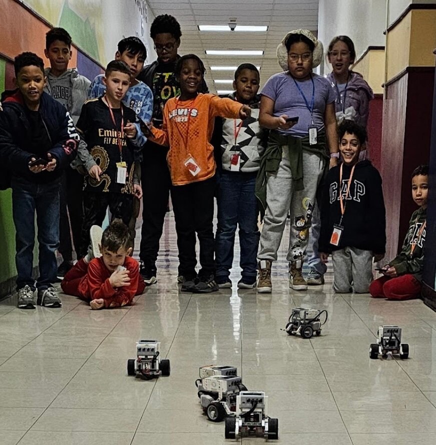 Students in CONNECT’s Robotics class are shown in a hallway of the Highland Falls Intermediate School recently – the class provides a “practical application for their daily math drills, allowing
